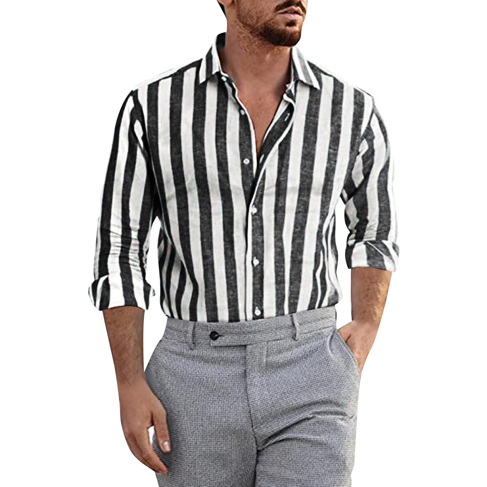 Men Fashion Casual Striped Print Cotton Linen Buckle Turn Down Collar Long Sleeve Shirt