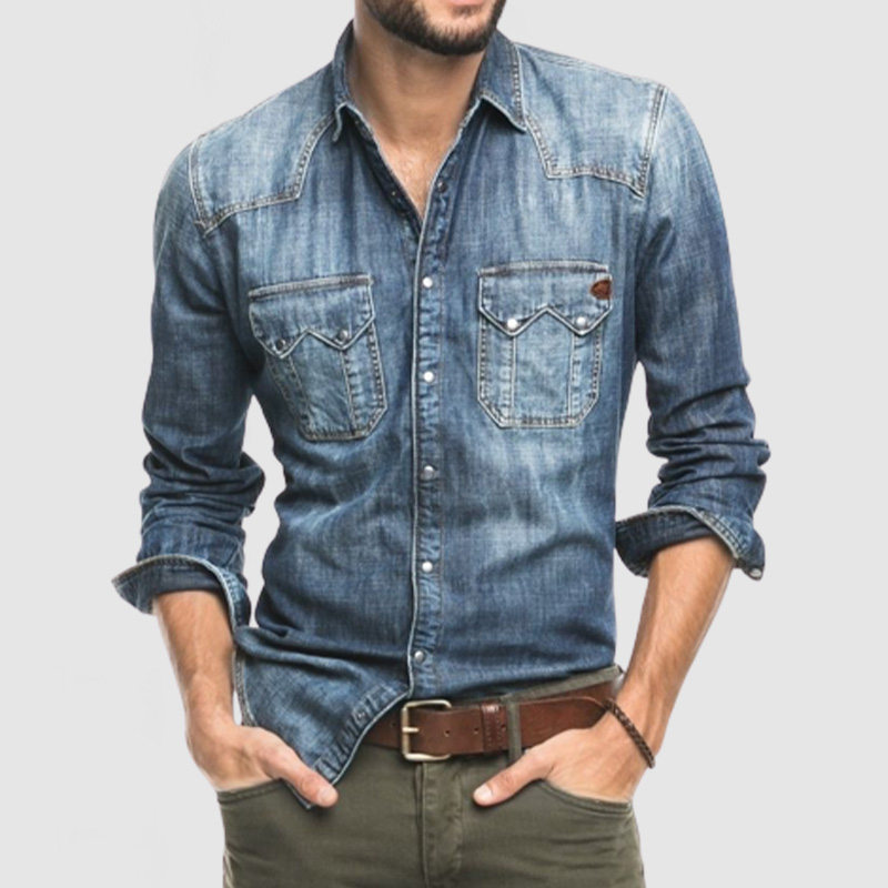 Men's New Double Pocket Men's Casual Long Sleeve Denim Shirt