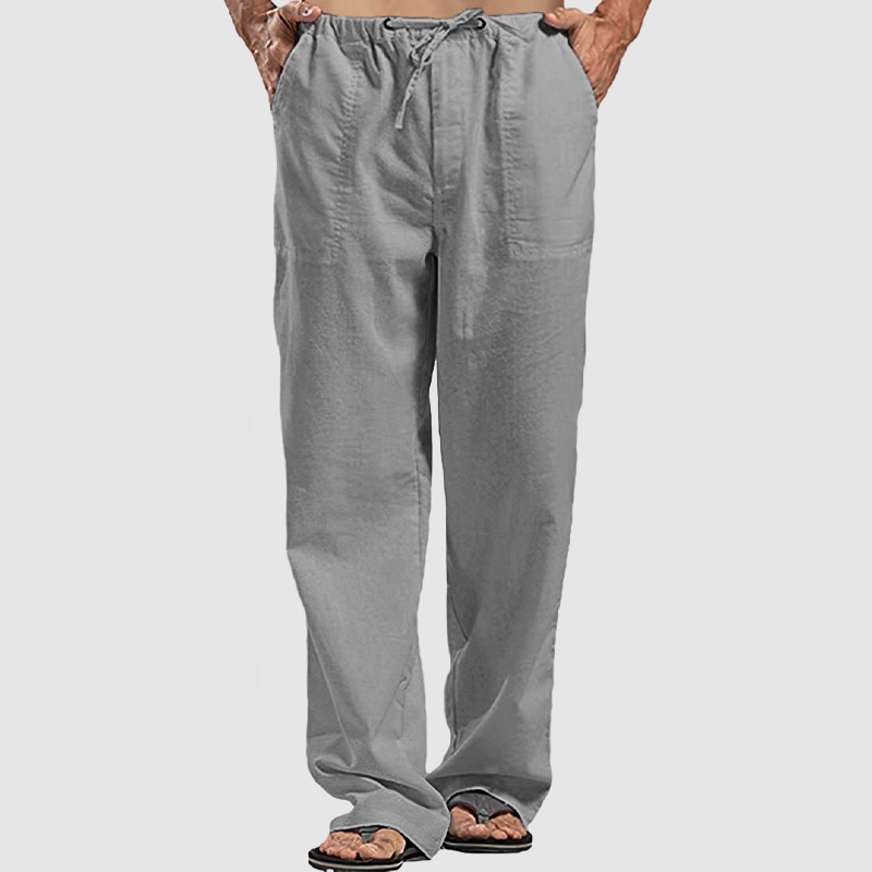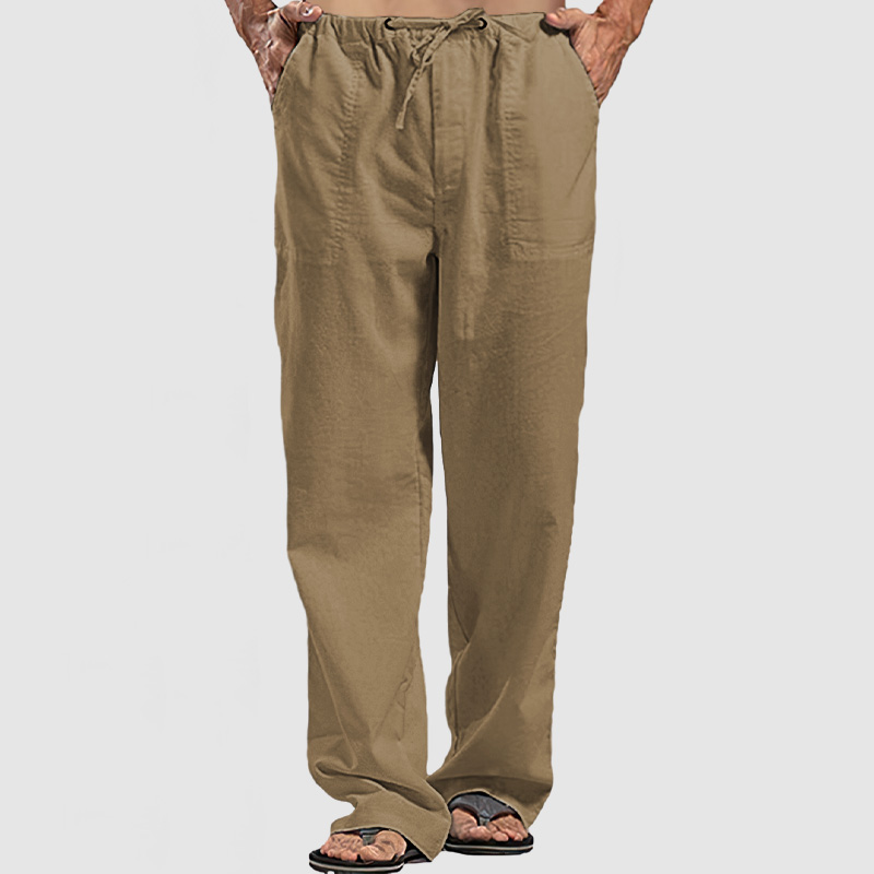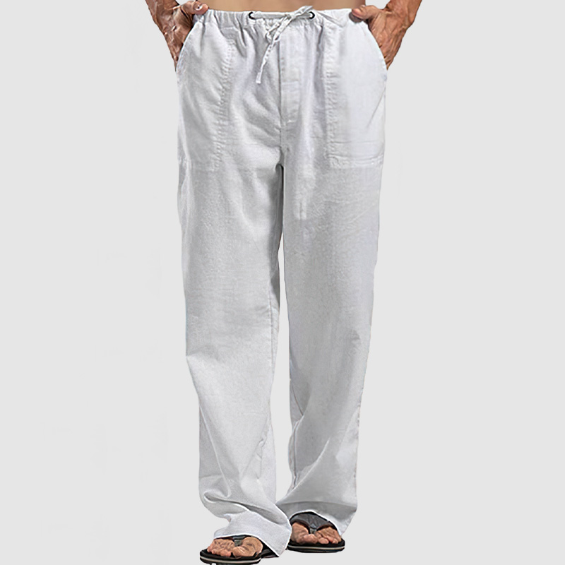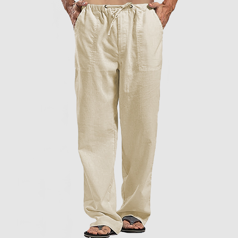 Wear the drawcord inside or outside to reduce bulk. The men's open-bottom linen-cotton pants with drawstrings for adjustability.