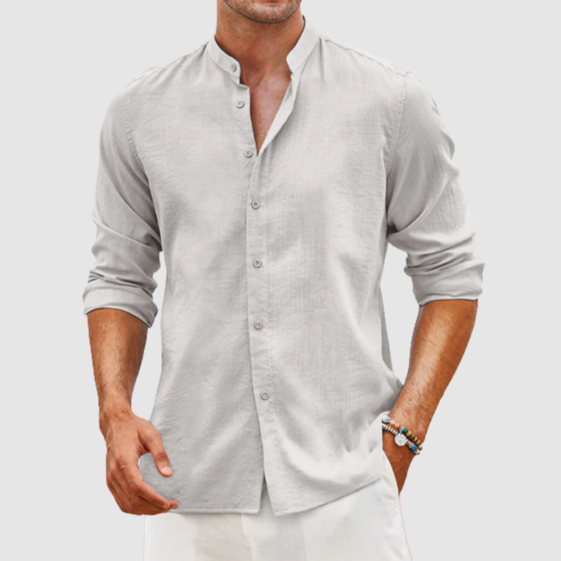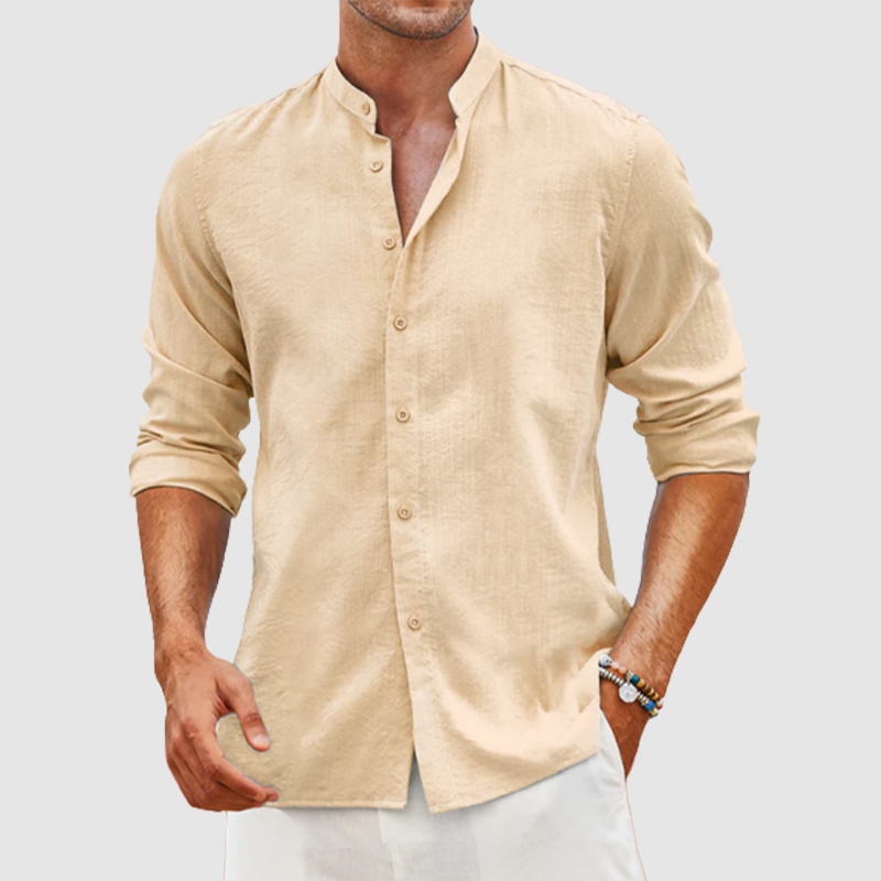 Men's linen cardigan solid color casual standing collar long sleeve shirt