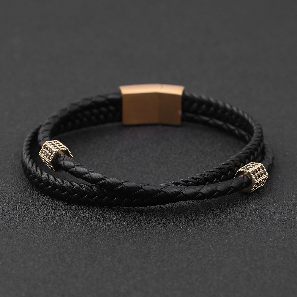 Men's multilayer woven leather bracelet Stainless steel diamond inset bracelet gift