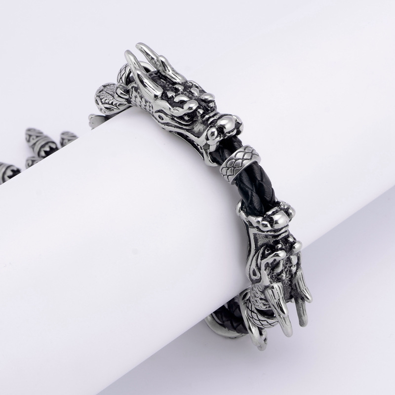 Men's titanium steel double Dragon leather bracelet titanium steel leather accessories