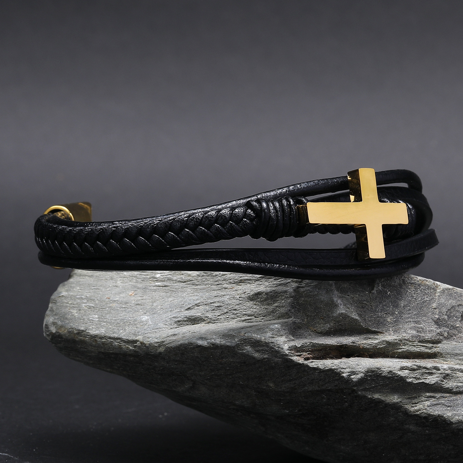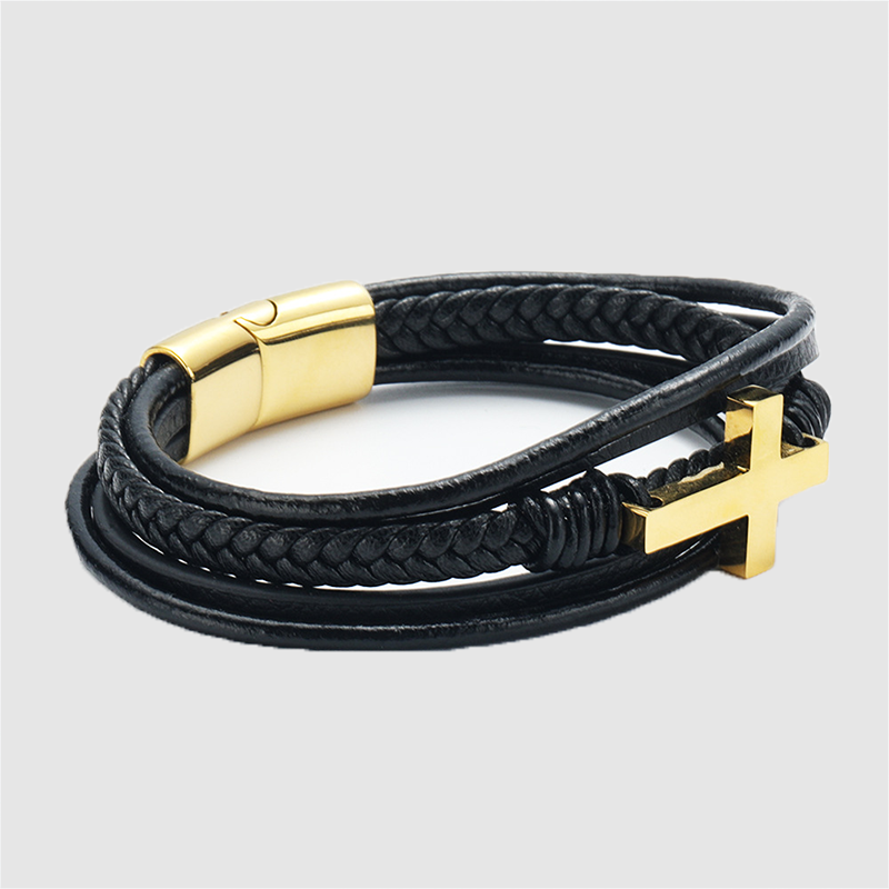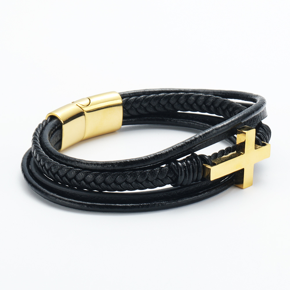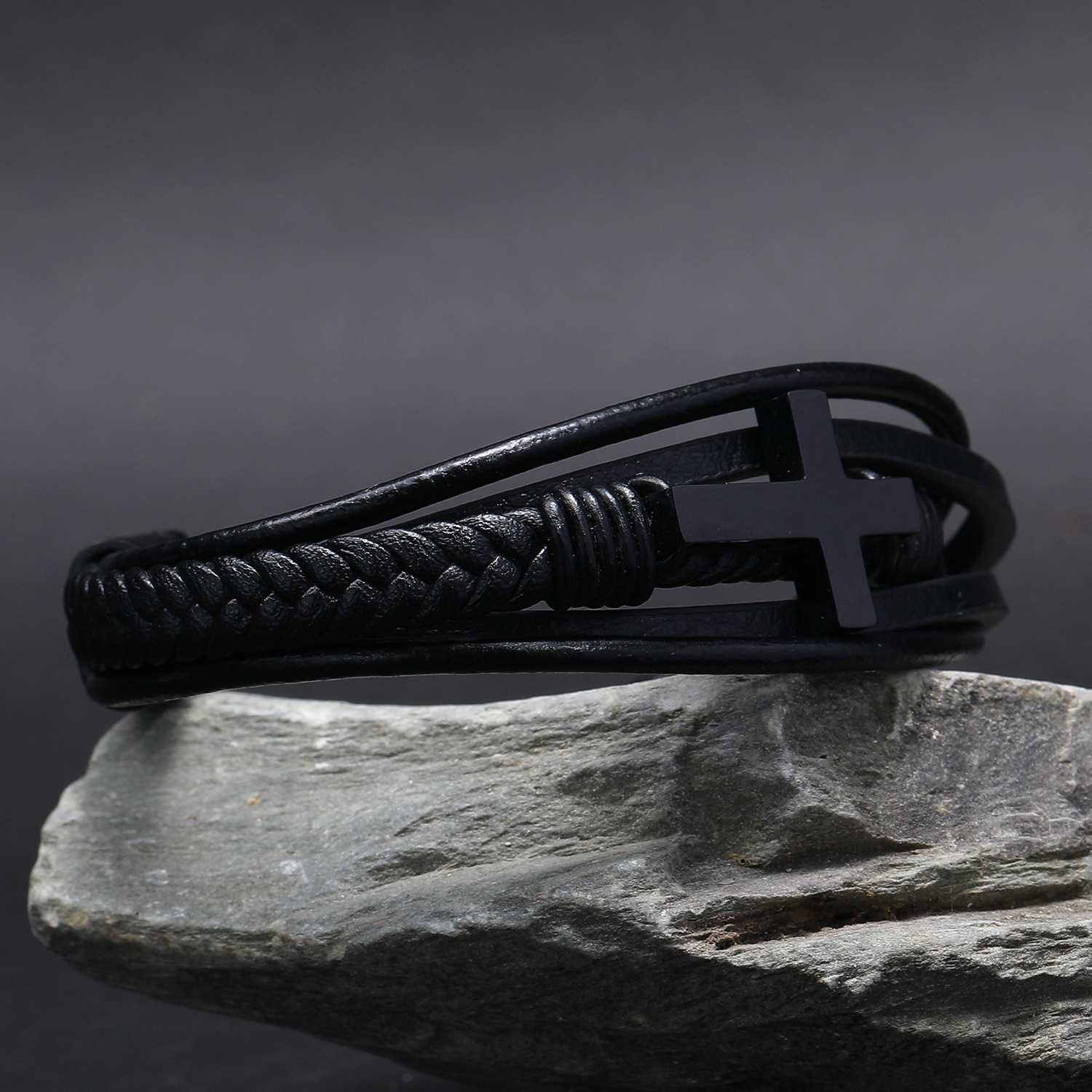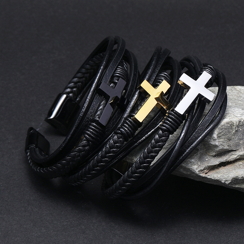 Men's woven leather magnetic buckle cross with a stainless steel bracelet