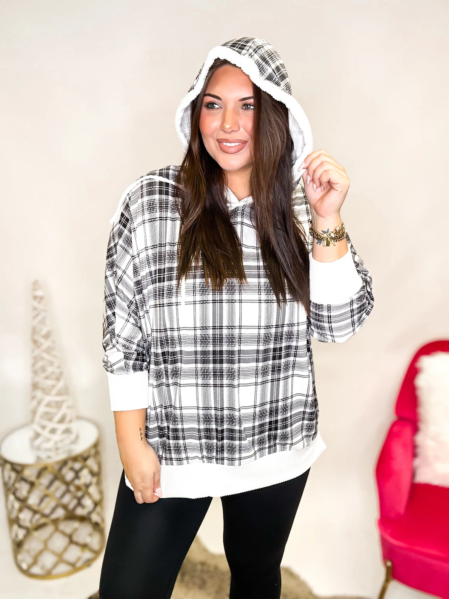 Experience the perfect blend of comfort and style with our Plaid Hoodie. Made with soft fabric, this 3/4 sleeve top features a flattering plaid design and a cozy hoodie for a chic yet relaxed look. Available in regular and curvy sizes. Elevate your wardrobe now!
